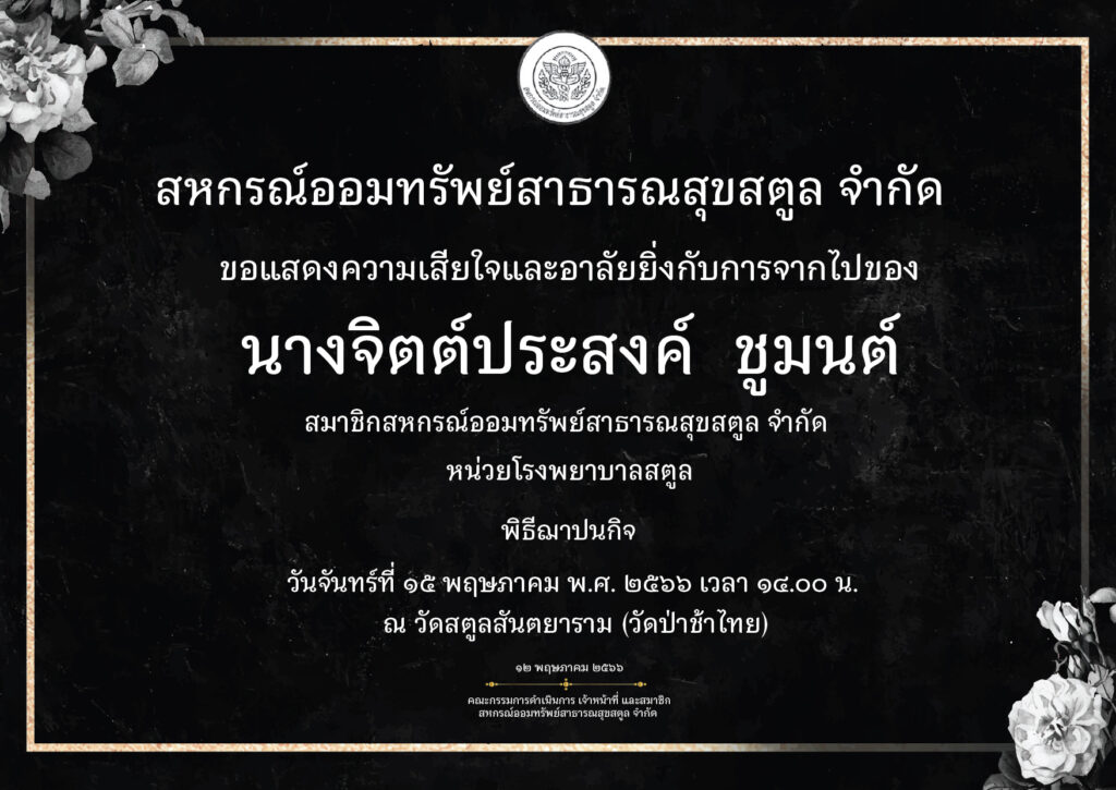 ขอแสดงความเสียใจและอาลัยยิ่งกับการจากไปของ นางจิตต์ประสงค์ ชูมนต์