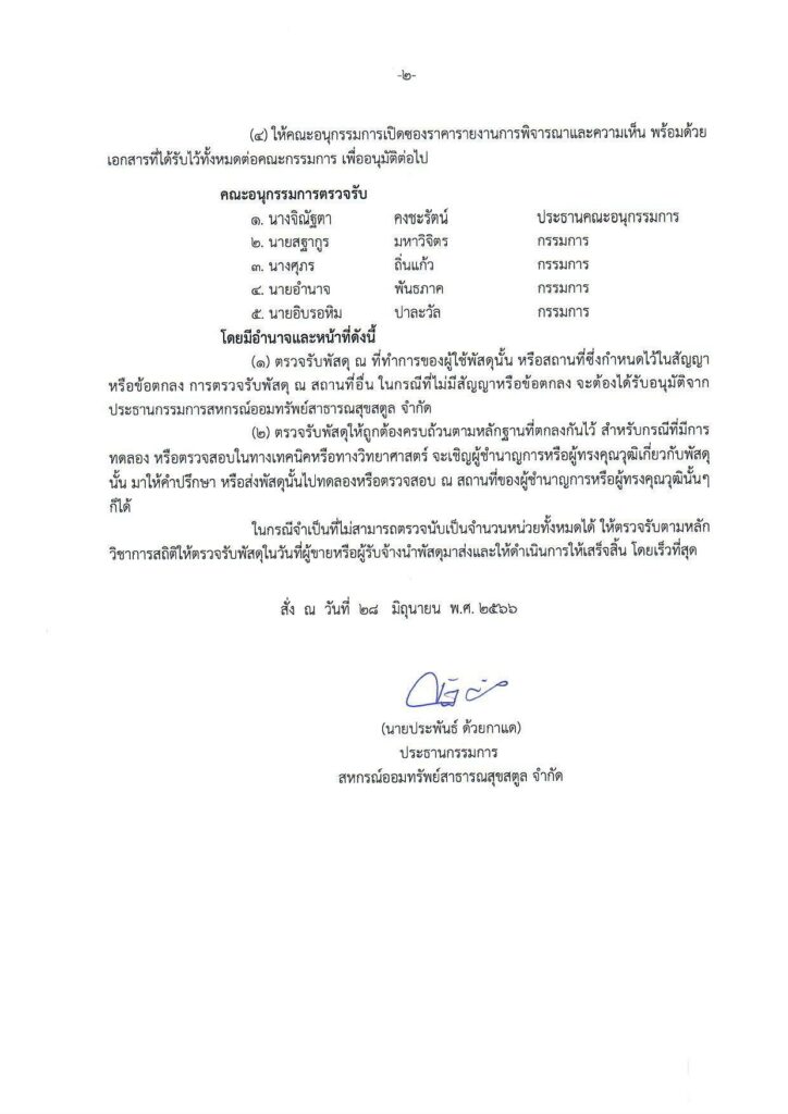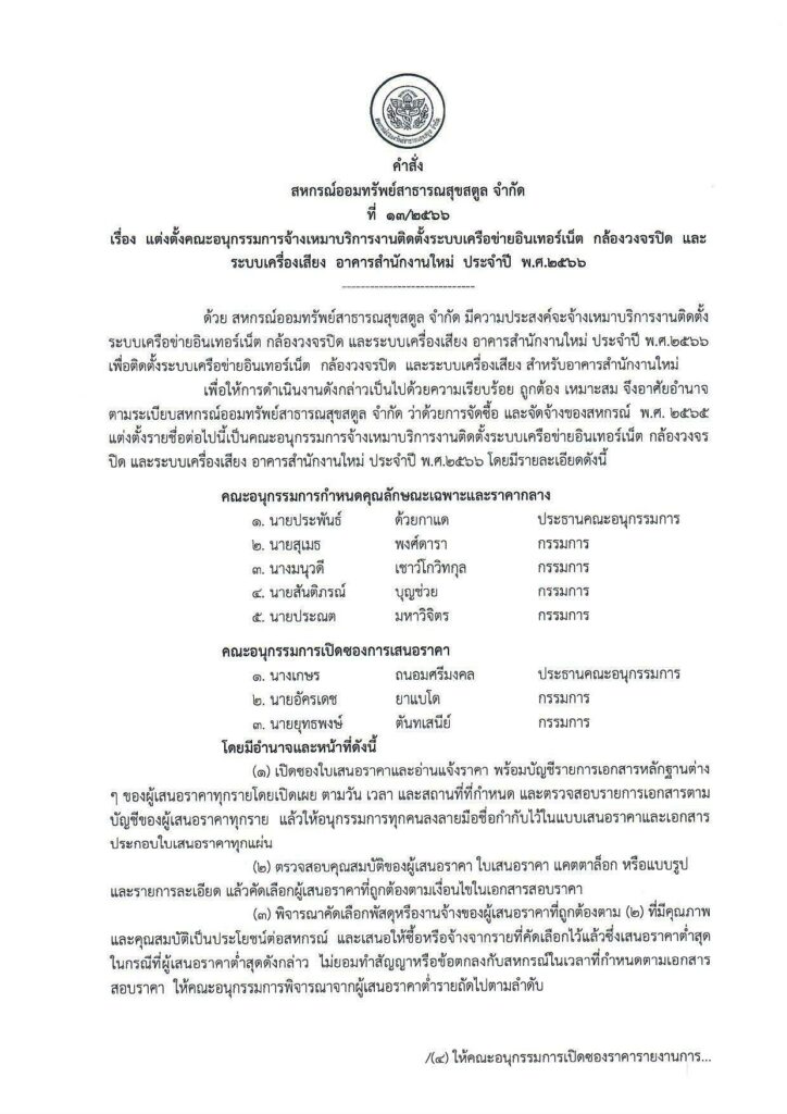 คำสั่ง สหกรณ์ออมทรัพย์สาธารณสุขสตูล จำกัด ที่ 13/2566 เรื่อง แต่งตั้งคณะอนุกรรมการจ้างเหมาบริการงานติดตั้งระบบเครือข่ายอินเทอร์เน็ต กล้องวงจรปิด และระบบเครื่องเสียง อาคารสำนักงานใหม่ ประจำปี พ.ศ.2566