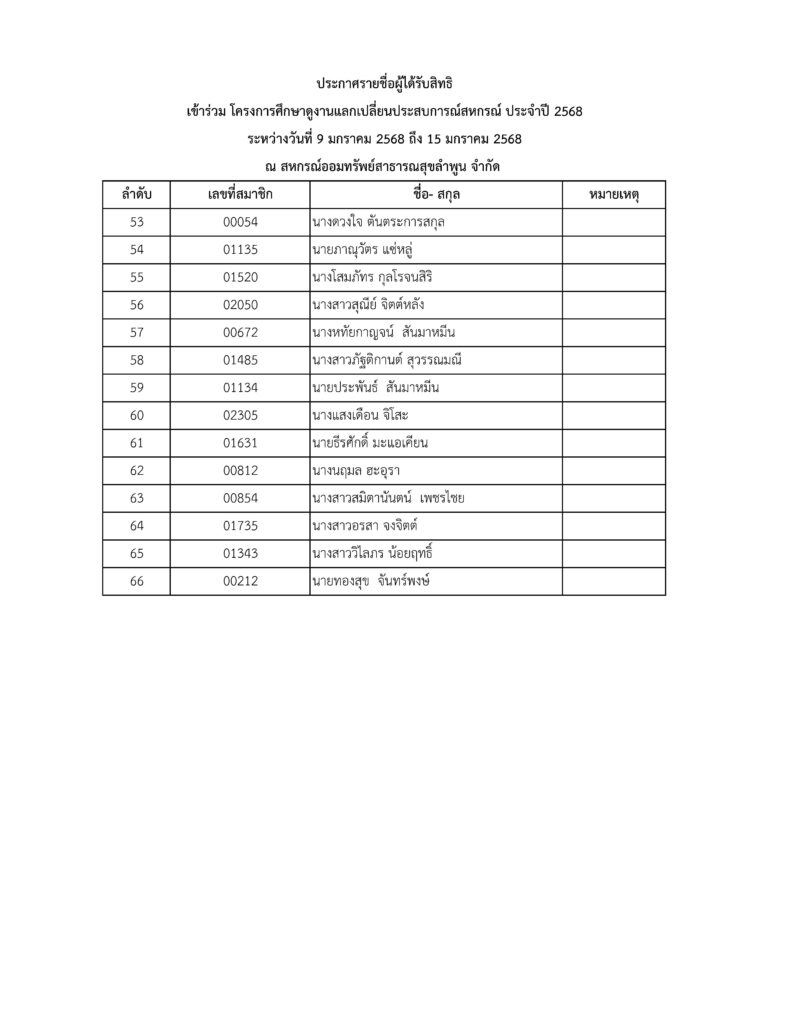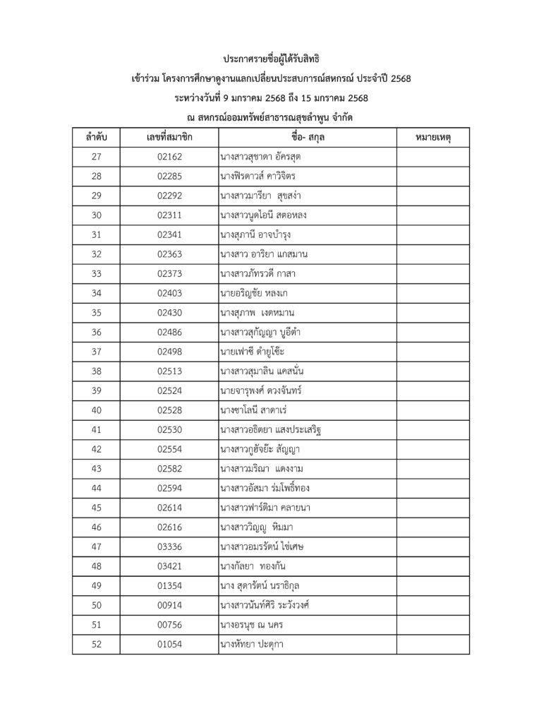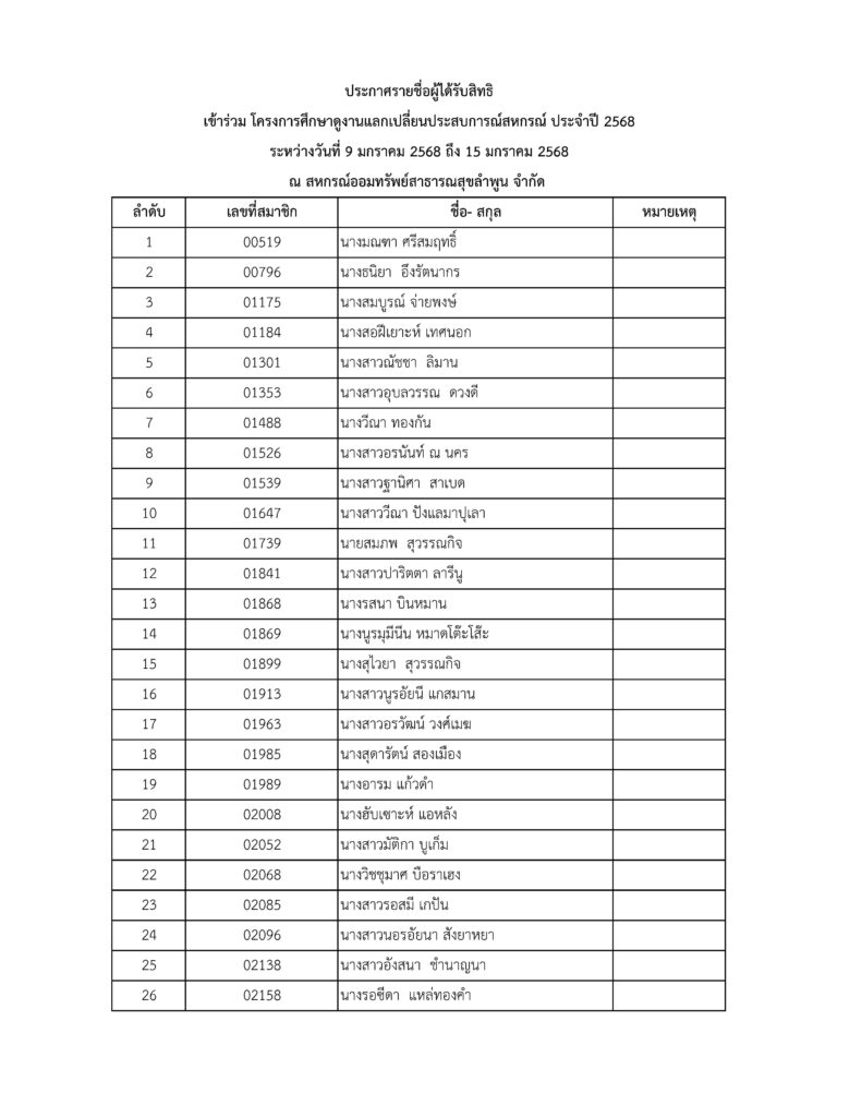 ประกาศรายชื่อผู้เข้าร่วมโครงการศึกษาดูงานแลกเปลี่ยนประสบการณ์สหกรณ์ ประจำปี 2568 ณ สหกรณ์ออมทรัพย์สาธารณสุขลำพูน จำกัด