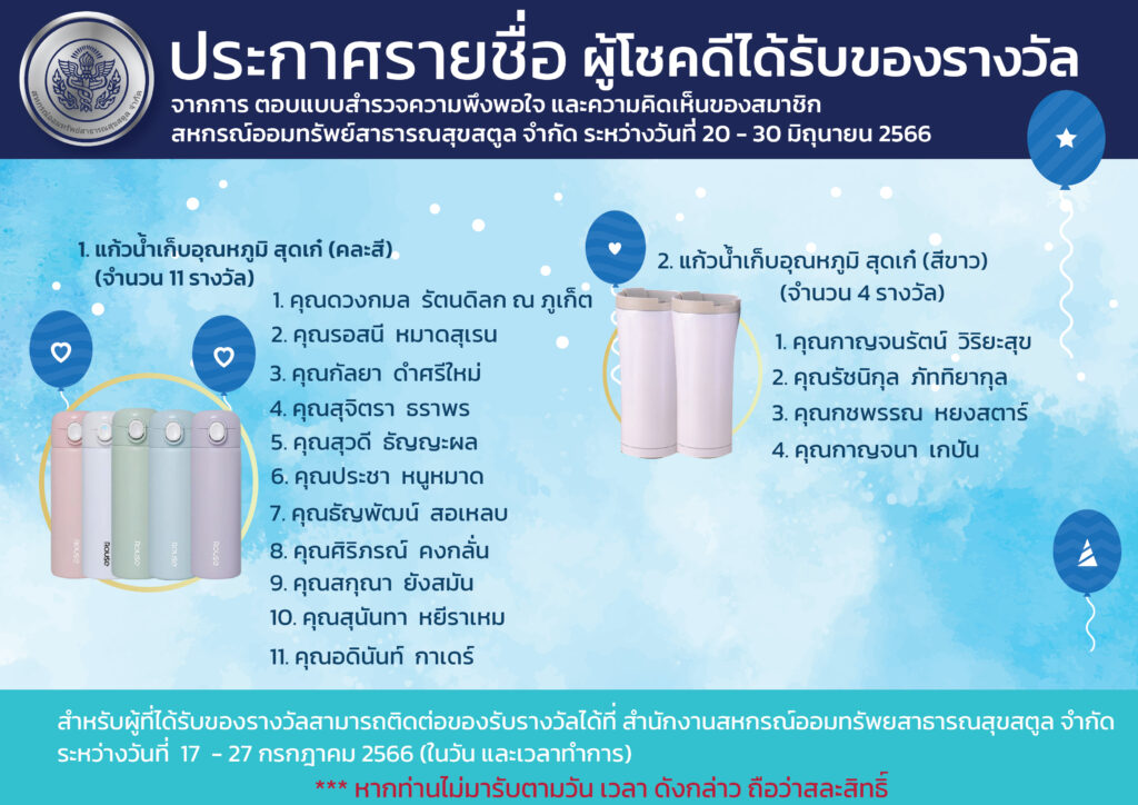 ประกาศรายชื่อผู้โชคดีได้รับของรางวัล จากการทำแบบสำรวจความพึงพอใจ และความคิดเห็นของสมาชิก สหกรณ์ออมทรัพย์สาธารณสุขสตูล จำกัด
