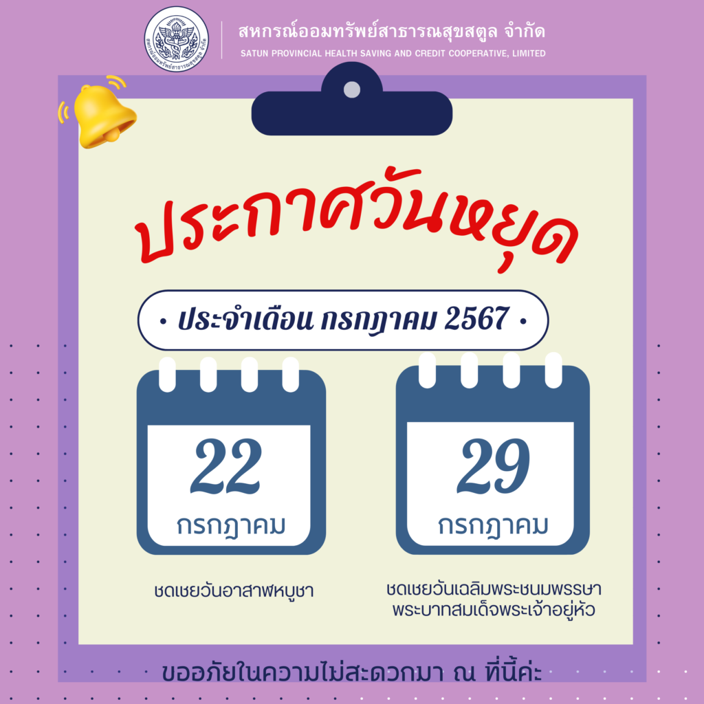 ประกาศวันหยุดทำการ ประจำเดือน กรกฎาคม 2567
