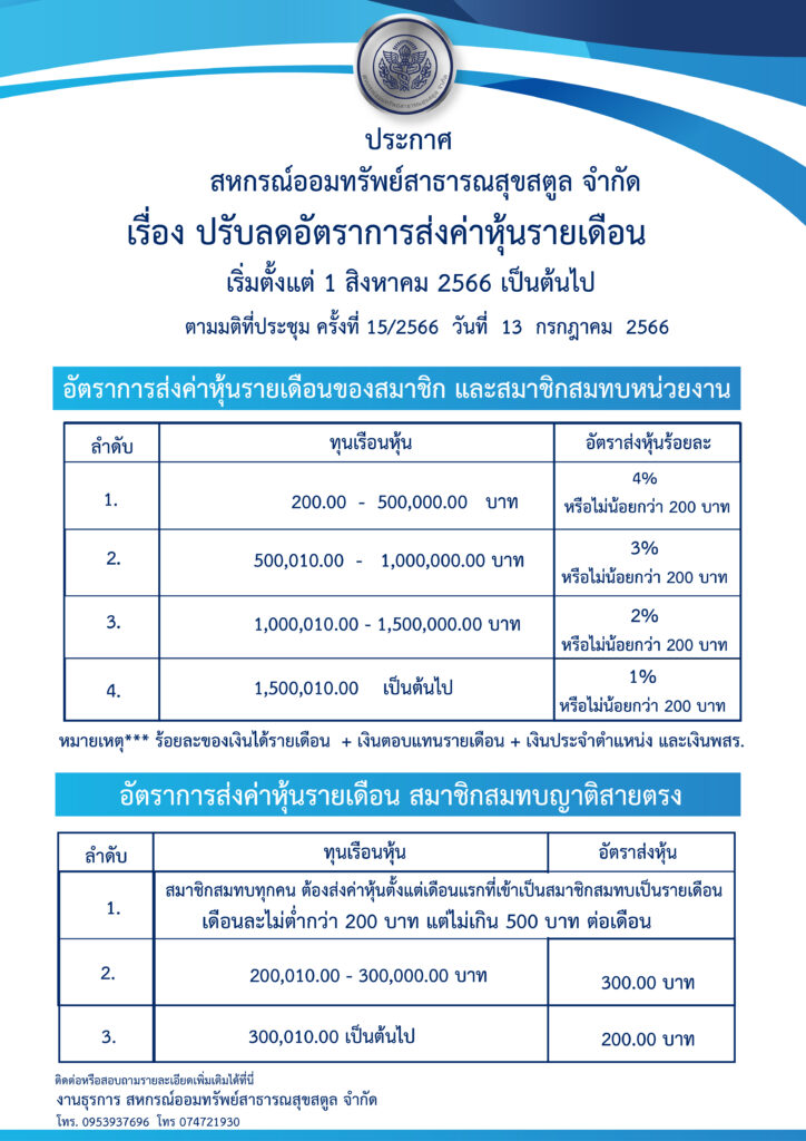 ประกาศสหกรณ์ออมทรัพย์สาธารณสุขสตูล จำกัด เรื่อง ปรับอัตราการส่งหุ้นรายเดือน