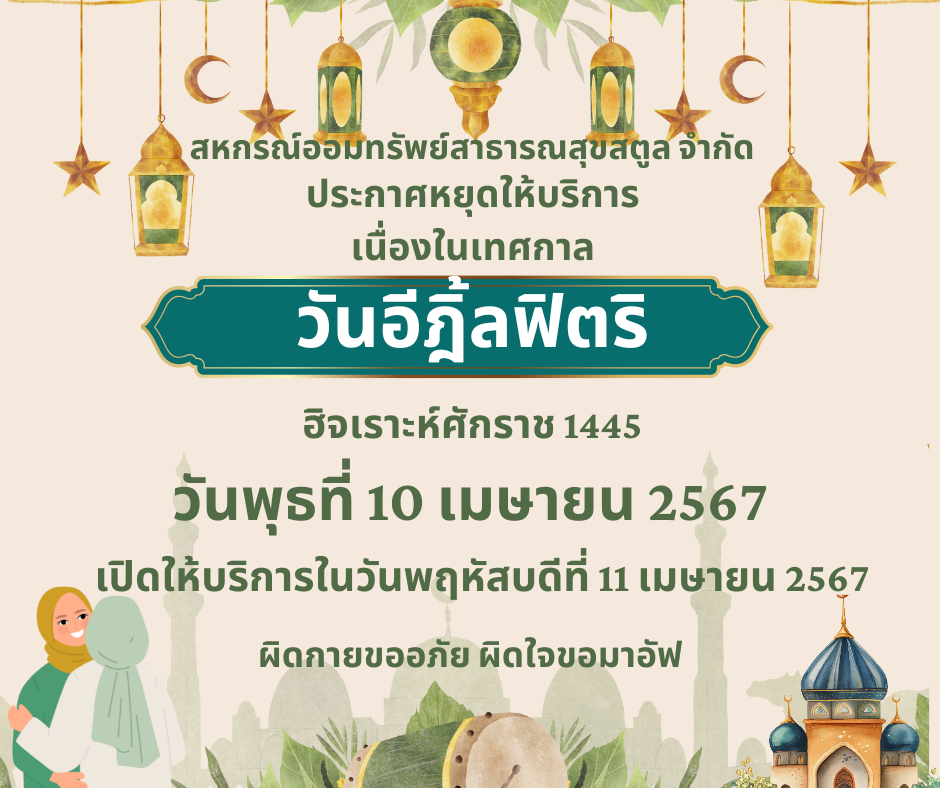 ประกาศหยุดให้บริการเนื่องในเทศกาลอีฎิ้ลฟิตริ ฮิจเราะห์ศักราช 1445