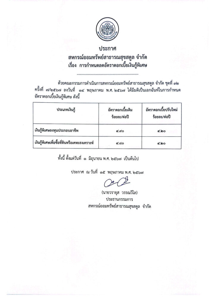 ประกาศอัตราดอกเบี้ยเงินกู้พิเศษ