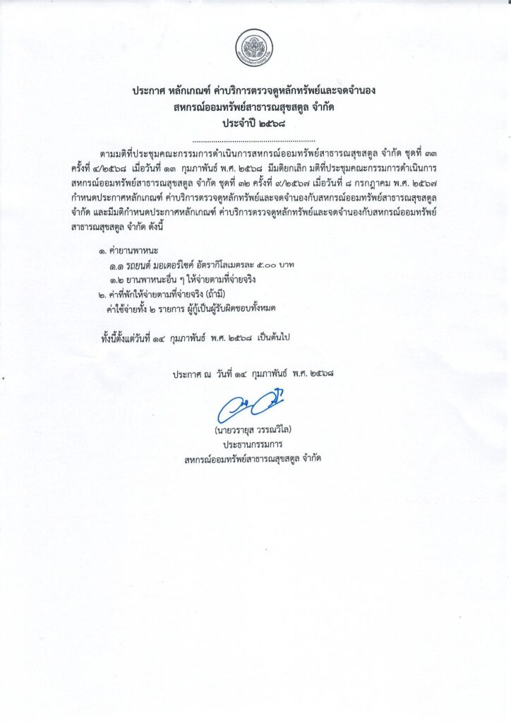 ประกาศ หลักเกณฑ์ ค่าบริการตรวจดูหลักทรัพย์ และจดจำนองสหกรณ์ออมทรัพย์สาธารณสุขสตูล จำกัด ประจำปี 2568