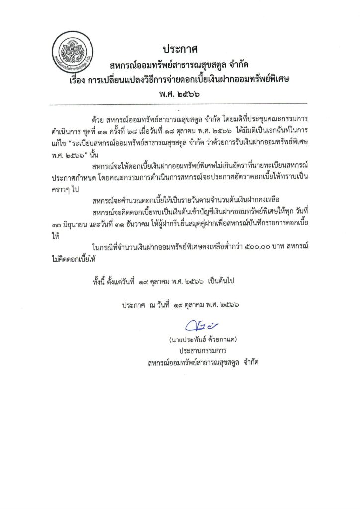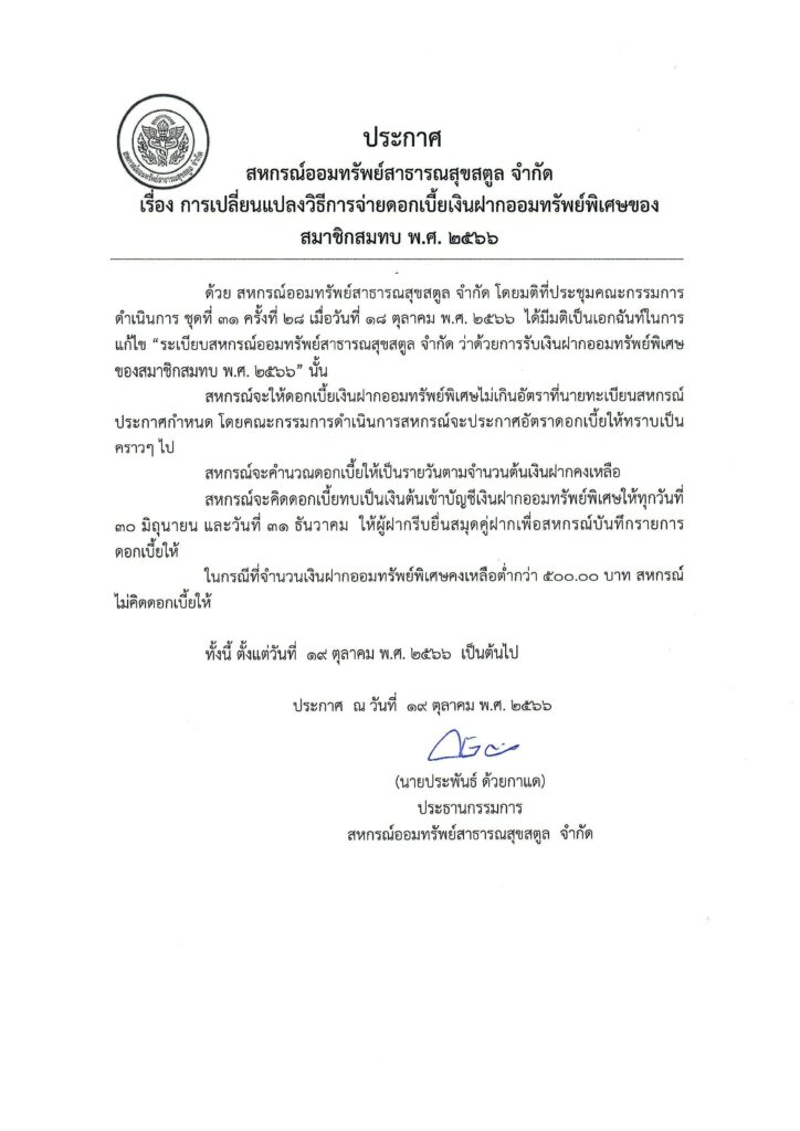 ประกาศ เรื่อง การเปลี่ยนแปลงวิธีการจ่ายดอกเบี้ยเงินฝากออมทรัพย์ พ.ศ. 2566