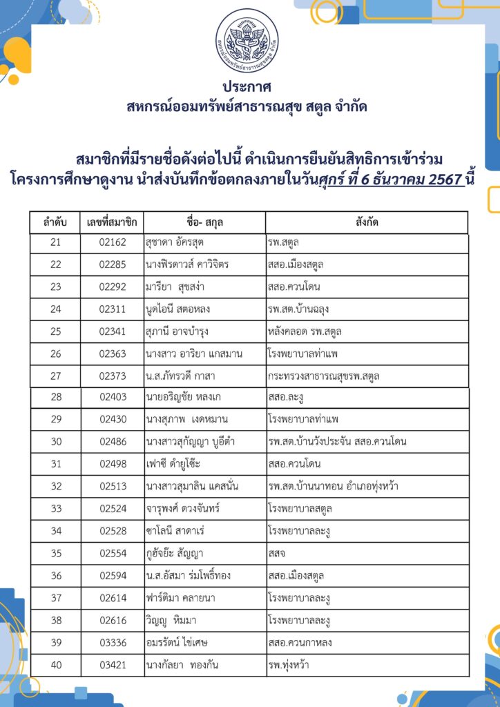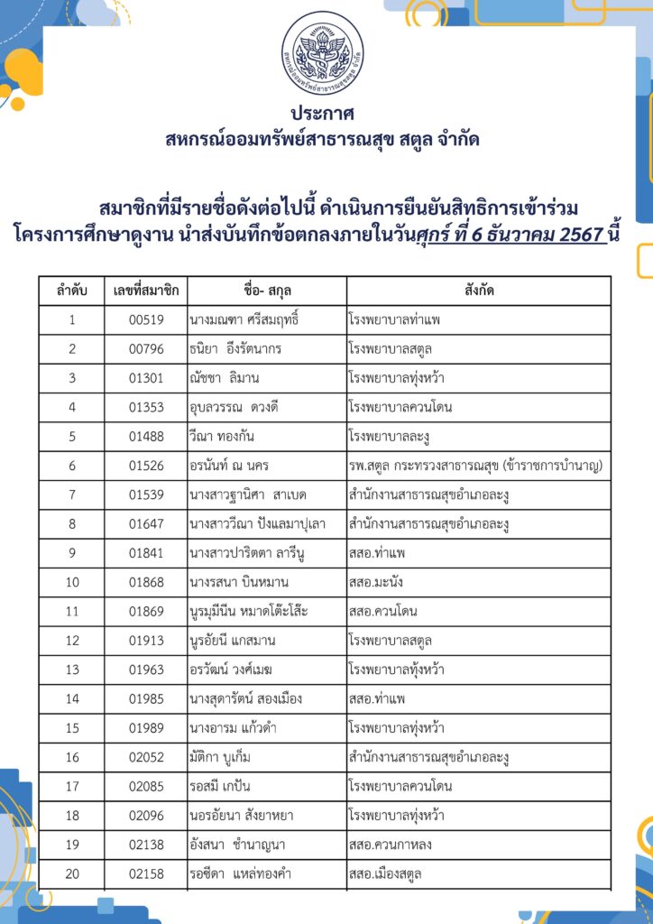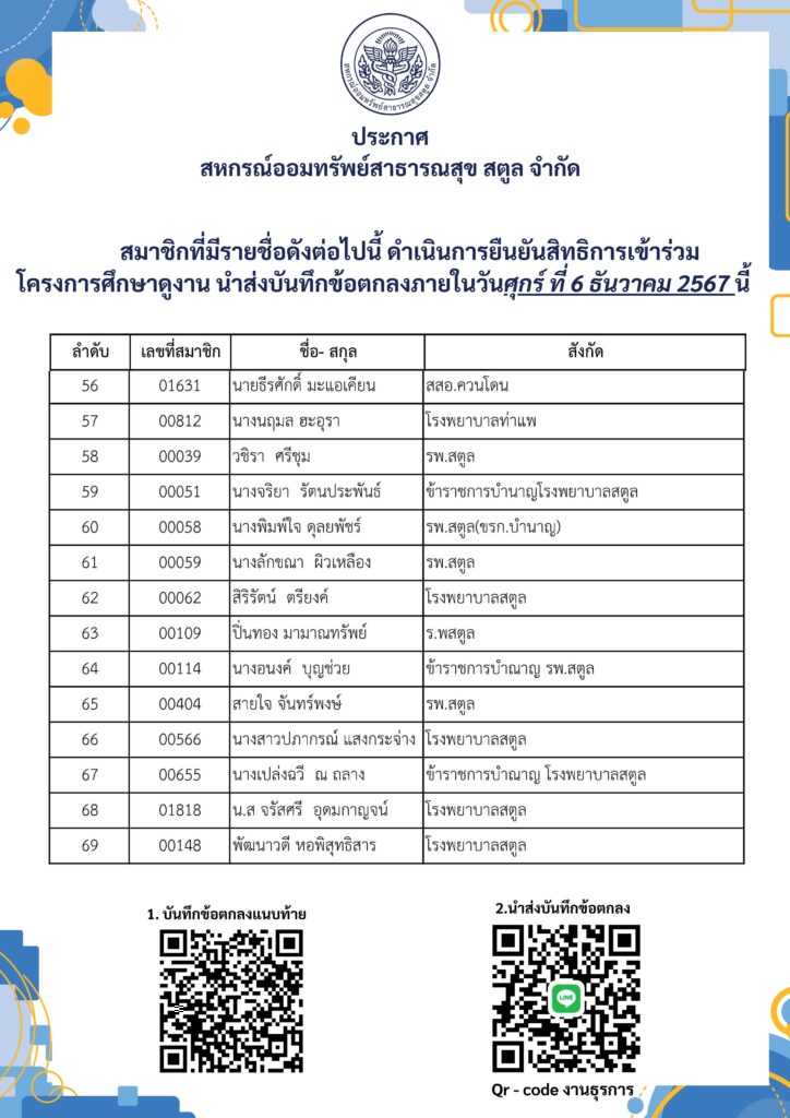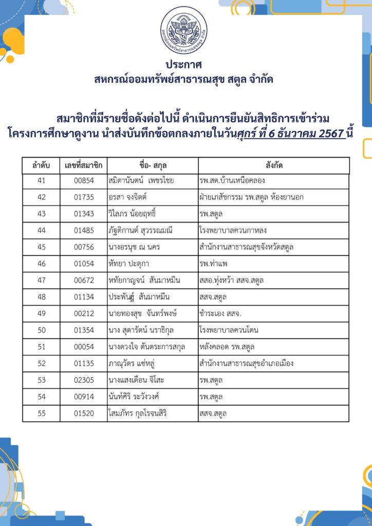 สมาชิกที่มีรายชื่อดังต่อไปนี้ ดำเนินการยืนยันสิทธิการเข้าร่วมโครงการศึกษาดูงาน