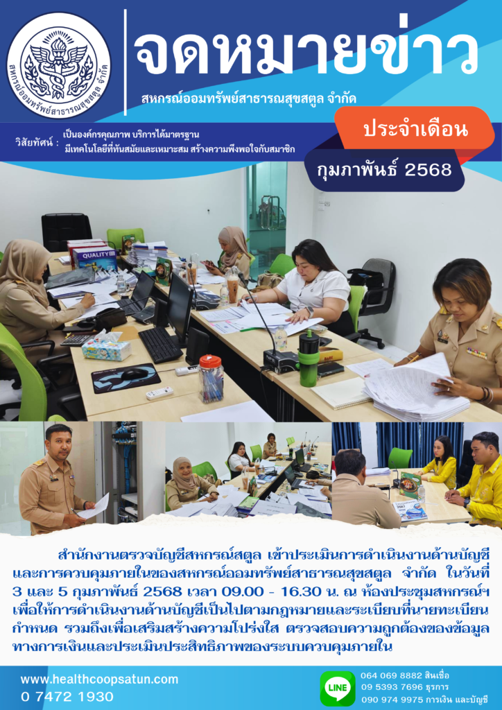 สำนักงานตรวจบัญชีสหกรณ์สตูล เข้าประเมินการดำเนินงานด้านบัญชี และการควบคุมภายในของสหกรณ์ออมทรัพย์สาธารณสุขสตูล จำกัด