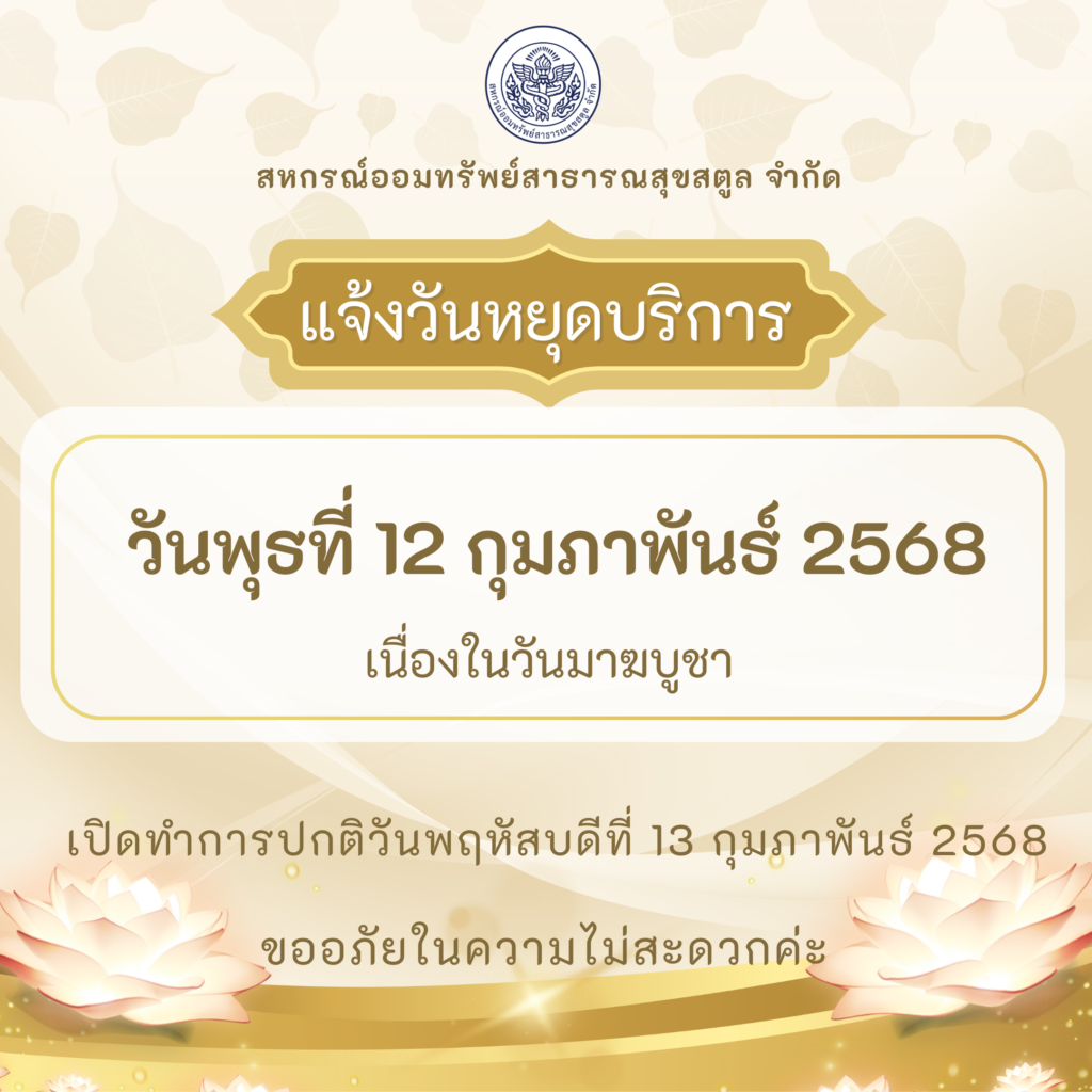 แจ้งวันหยุดให้บริการวันพุธที่ 12 กุมภาพันธ์ 2568 เนื่องในวันมาฆบูชา