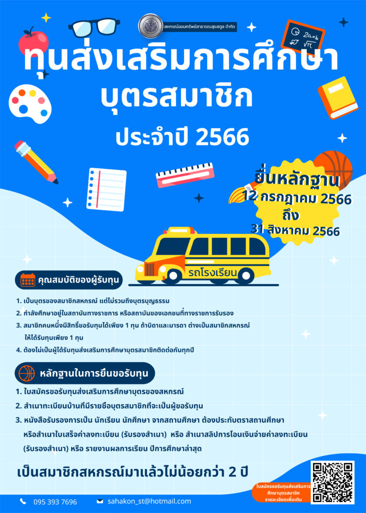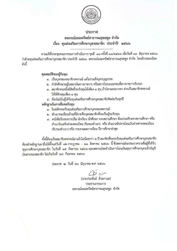 ประกาศสหกรณ์ออมทรัพย์สาธารณสุขสตูล จำกัด เรื่อง ทุนส่งเสริมการศึกษาบุตรสมาชิก ประจำปี 2566
