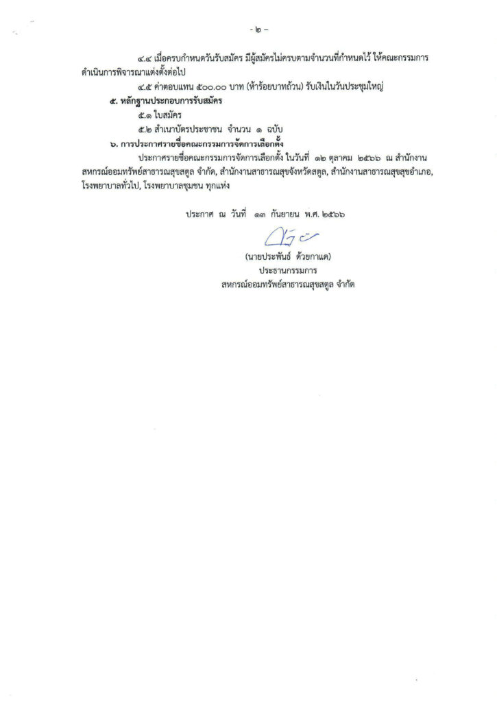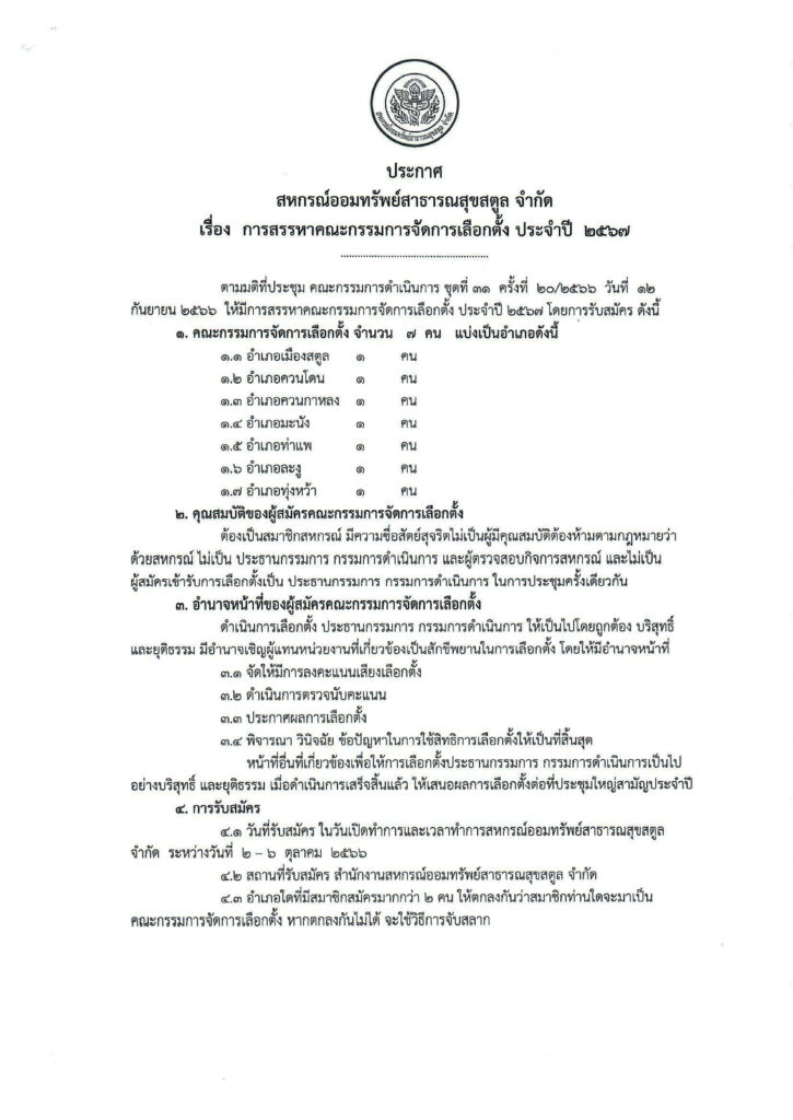 ประกาศ สหกรณ์ออมทรัพย์สาธารณสุขสตูล จำกัด เรื่องการสรรหาคณะกรรมการการจัดการเลือกตั้ง ประจำปี 2567