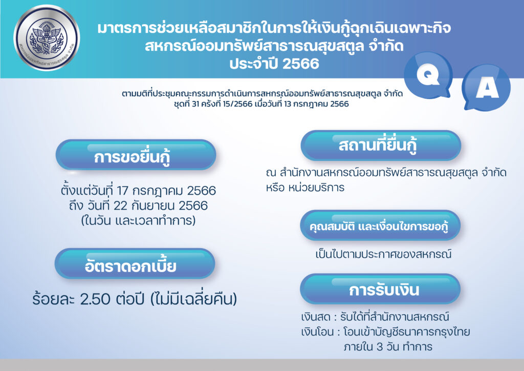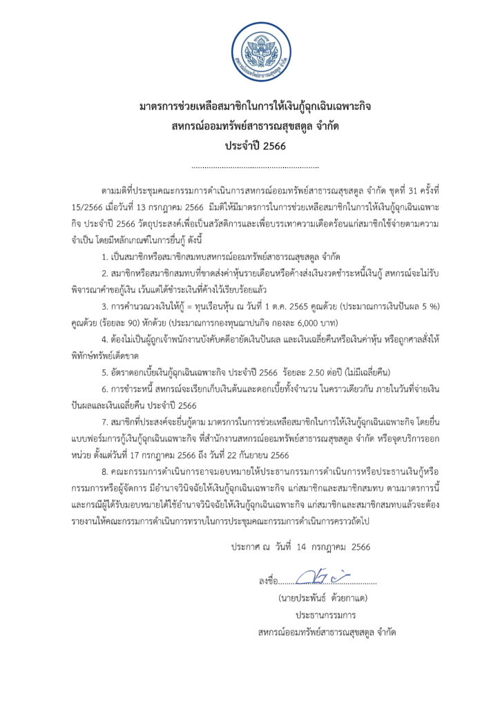 ประกาศ มาตรการช่วยเหลือสมาชิกในการให้เงินกู้ฉุกเฉินเฉพาะกิจ ประจำปี 2566