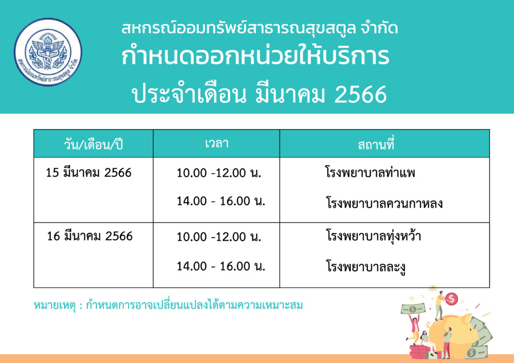 สหกรณ์ออมทรัพย์สาธารณสุขสตูล จำกัด กำหนดออกหน่วยให้บริการสมาชิก ประจำเดือน มีนาคม 2566
